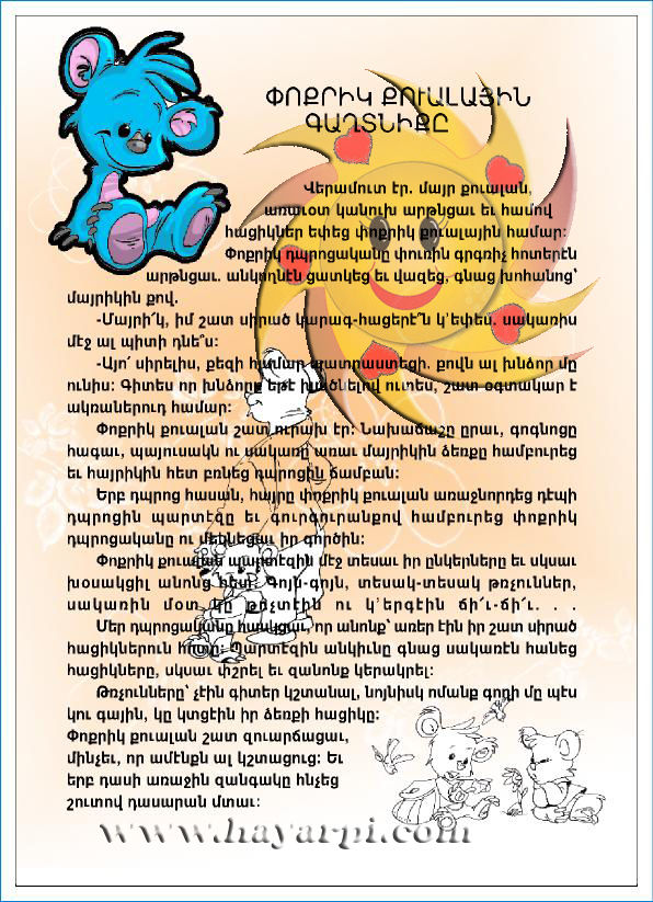 Փոքրիկ քուալան շատ ուրախ էր: Նախաճաշը ըրաւ, գոգնոցը հագաւ,պայուսակն ու սակառը առաւ մայրիկին ձեռքը համբուրեց եւ հայրիկին հետ բռնեց դպրոցի ճամբան: