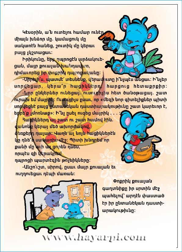 – Նոր ընկերներ ունեցայ. ուսուցիչիս հետ ծանօթացայ.շատ ուրախ եմ մայրիկ: Ուսուցիչս ըսաւ, որ «մեզի նոր գիտելիքներ պիտի սորվեցնէ բայց ընտանեկան դաստիարակութիւնը շատ կարեւոր է, երբե՛ք չմոռնաք»: Ի՞նչ ըսել ուզեց մայրիկ…: Հացիկներդ ալ շա՜տ ու շա՜տ համով էին. զանոնք կերայ մեծ ախորժխկով, ձեռքերուդ դալար: Վաղն ալ նոյն հացիկներէն կը դնե՞ս սակառիս մէջ: Պիտի խնդրեմ, որ քանի մը ափ ալ ցորեն դնես, որպէսզի կերակրեմ դպրոցի պարտէզին թռչնիկները: