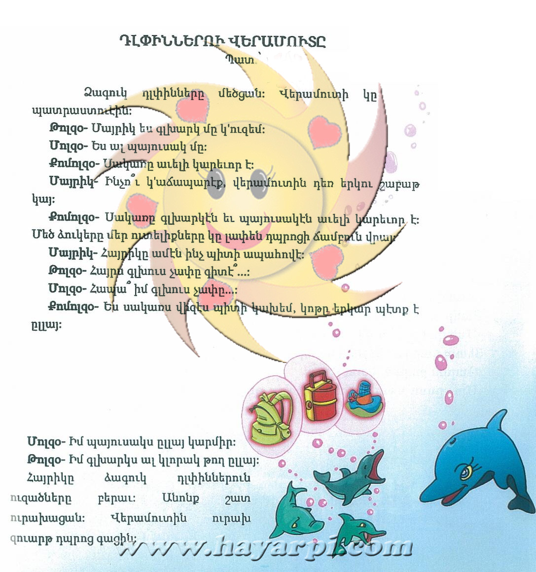 Հայրիկը ձագուկ դլփիններուն ուզածները բերաւ: Անոնք շատ ուրախացան: Վերամուտին ուրախ զուարթ դպրոց գացին:
